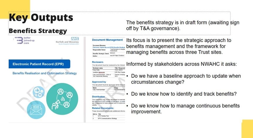 max20 undertook a structured review framework, including weekly updates and reports to executive and steering groups thus ensuring consistency and shared understanding across the Trusts. This enabled full support of the Benefits Framework and its associated Strategy across all areas of the programme and organisations, for the EPR programme.